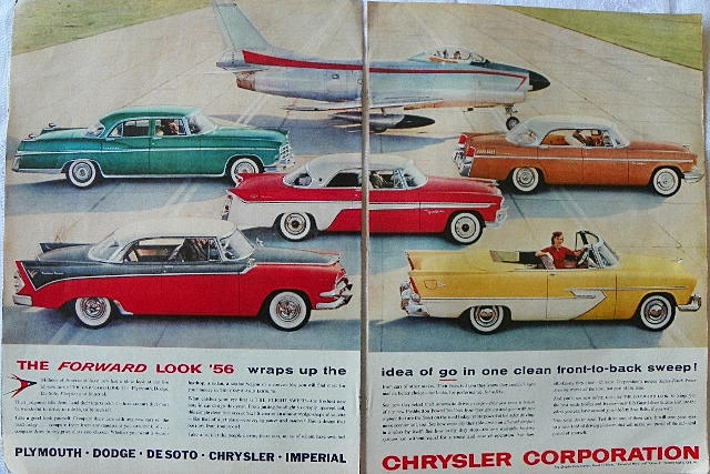 Here's a two-page magazine ad for the 1956 cars from Chrysler Corporation.